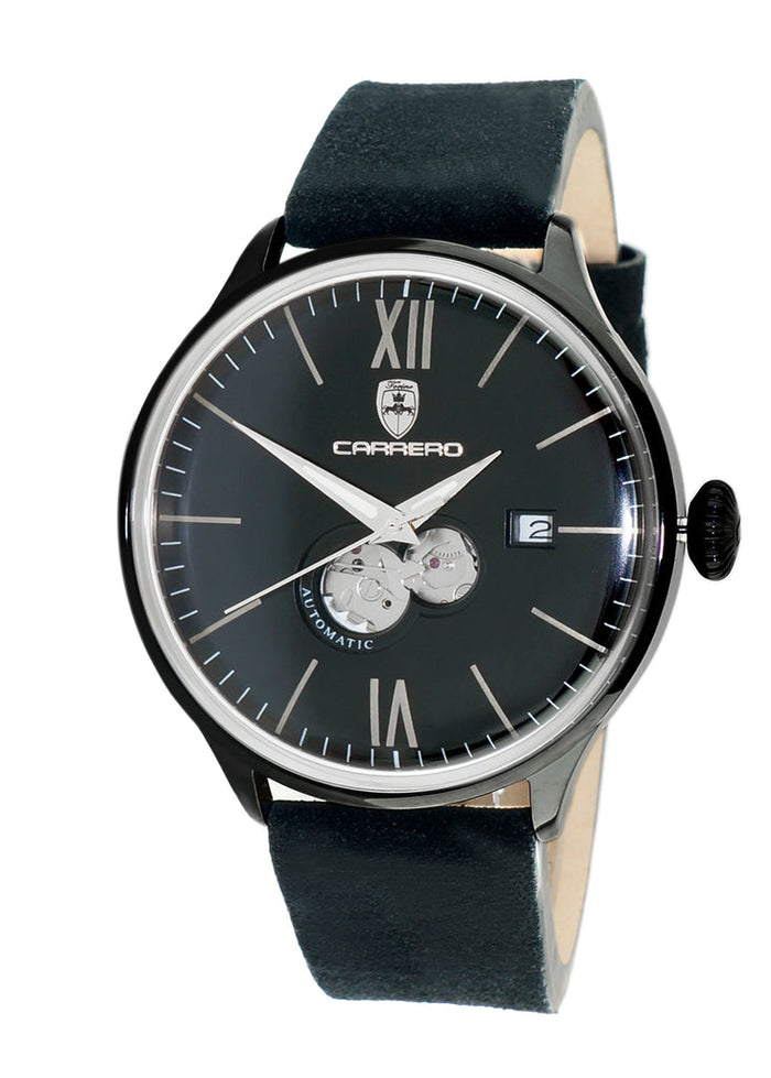TORINO CARRERO MEN'S WATCH,NH35 (24-JEWELS AUTOMATIC), OPEN HEART BEAT CURVE BLACK DIAL, IP-BLACK TONE STAINLESS STEEL CASE , SUEDE BLACK GENUINE LEATHER BAND