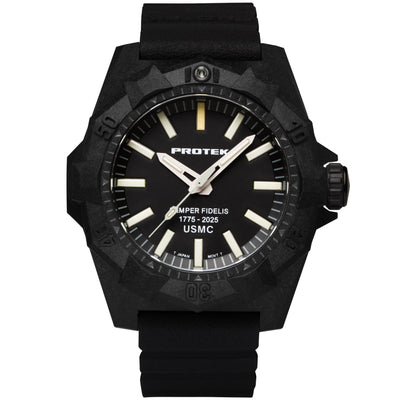 ProTek is a brand of tritium tactical watches designed for Law Enforcement, Fire Fighters, SWAT, Tactical, Military, Special Forces, and First Responders. ProTek is a no-excuses brand that is Rugged at Heart and built to handle what life demands in any environment, lending credence to the tag line All Terrain Watches. ProTek watches were submitted to the US Marine Corps and were approved as an Official Watch of the USMC based on the accuracy, durability and superior ProGlo illumination that make these ideal timepieces to serve Marines in the line of duty, and in their daily lives. Specifications: 45mm Carbon Composite Case and 60-Click Dive Timing Bezel, 316L Stainless Steel Embossed ScrewUSMCCaseback, Steel Screw Crown with Multiple O-Rings, Sapphire Crystal with Antireflective Coating, Water Resistant to 300 Meters (all watches tested in air and water), Genuine Rubber Strap (22mm x 20mm) with Signature Buckle and a Steel Tube Molded into the Rubber for Additional Durability, with matching colors Used for the Rubber Grip on the Crown, Dependable Japanese Quartz Citizen/Miyota Super 2035 3-Hand & Date Movement with 4-Year Battery, Swiss self-powered ProGlo illumination system.