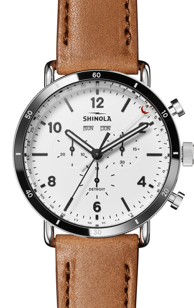 An elevated timepiece for your everyday, this 45mm Canfield Sport is designed to strike up conversation. This chronograph features polished stainless steel case, black ceramic bezel and matte white velvet dial punctuated with three sub dials and dual calendar aperture. This watch is instinctively sporty and with Its versatile colorways wardrobe staple.