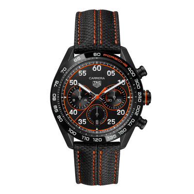 Speed is the name of the game in this TAG Heuer Carrera Porsche Special Edition. Paying tribute to the passion for racing shared by TAG Heuer and Porsche, it distills a bright orange inspired by the color of the sparks of heat made by the car on the asphalt. Victory is on the horizon.
