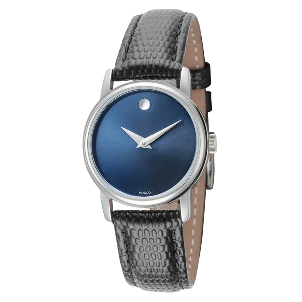 Movado Women's Classic Museum Quartz Watch. The case is built with high-quality Stainless Steel and can withstand up to 30 m (100 feet) of water resistance. The dial is Blue and protected by a Sapphire Crystal Scratch Resistant. The Strap is Black Leather with a Pin Buckle. The movement is Swiss-Made Quartz. (2100010)