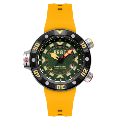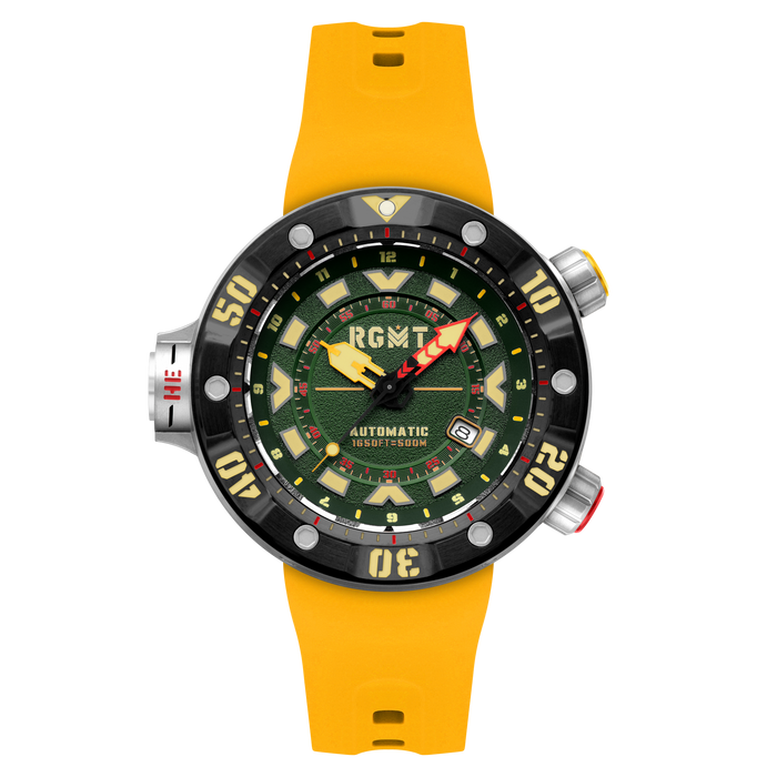 Named after one of the most formidable tools in naval history, the Depth Charge is purpose-built for deep-water dominance with an exceptional 50 ATM water resistance rating, The Depth Charge is also equipped with a helium release function and full luminous application across index, hands, and bezel. It is one of the toughest dive instruments in the RGMT arsenal.