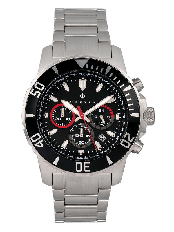 316L Surgical-Quality Stainless Steel Case Japanese Miyota JS25 Quartz Movement Full-Function Chronograph Non-Glare Sapphire Crystal Logo-Engraved Stainless Steel Caseback Rotating Bezel with Aluminum Insert Screw Down Crown 316L Surgical-Quality Stainless Steel Bracelet Logo-Engraved Stainless Steel Clasp Helium Release Valve Swiss Super-LumiNova Hands Swiss Super-LumiNova Markers Date Display 24-Hour Sub-Dial 45mm Case Diameter 50 ATM Water Resistant (Professional Deep Diving Approved)
