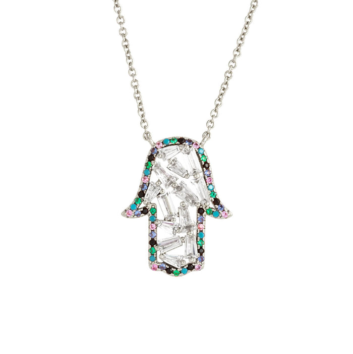 The Hamsa has been a symbol of protection for centuries, making it a meaningful gift for someone you love. The timeless charm is adorned with multicolored round and baguette stones, which attract light and peace.