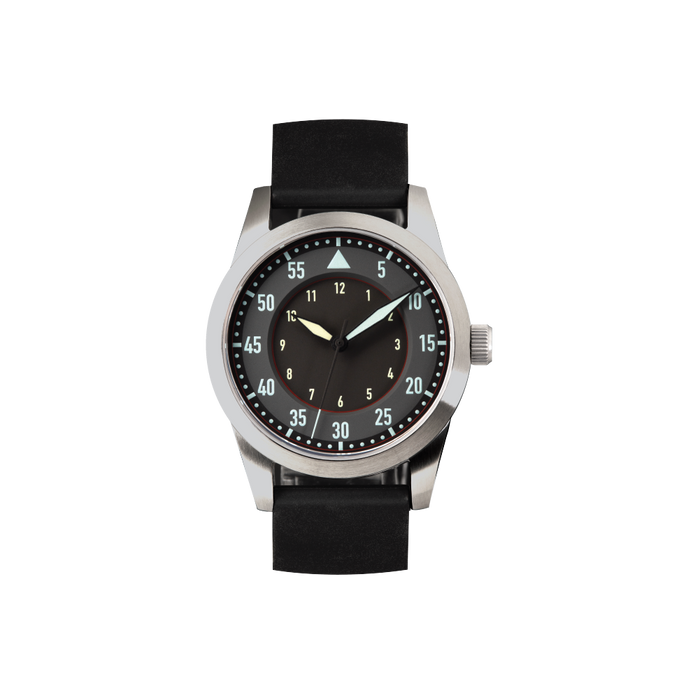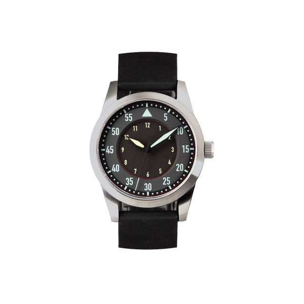 "Flieger" is the German word for "pilot" . The Brillier Flieger Editions are inspired by military aviator watches from 1930s and 40's. Known for their functional and intuitive styling, the dial features an outer ring for minute markers and a inner ring for hour markers with an arrow head at 12 o'clock position. The two tone lume and ultra deep double sunken dial further distinguishes the hour and minute markers.The design adds pops of red and gray for visual legiblility and ergonomics. Powered by a FTSUSA Americhron 'Built to Last' Automatic Movement, our Flieger editions are is proudly assembled/ built and tested for perfection in the USA using domestic and globally sourced components.