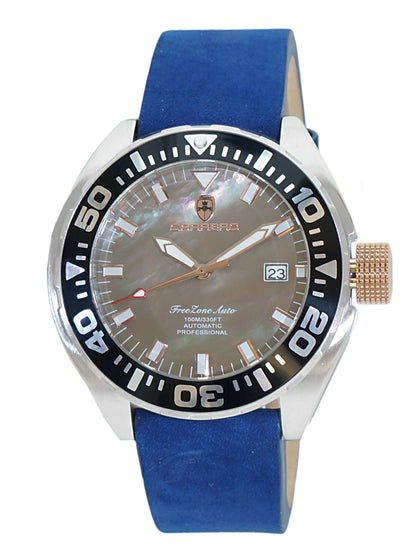 TORINO CARRERO FreeZone-Auto, Men's Automatic NH35-24 JEWEL Mov't, Brown MOP- Dial - Black Bezel, Suede Blue Genuine Leather Band.