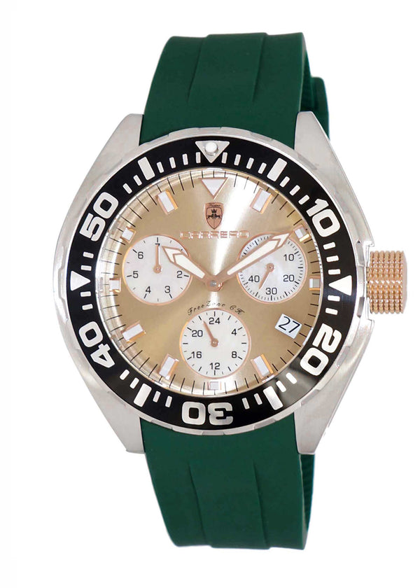 TORINO CARRERO FreeZone-CH, Men's Swiss Multi-Functiom Ronda X30 Movement, Brown Dial with White MOP Sub-dial- Black Bezel - Rosetone Crown, Green Silicon Band,Rosetone