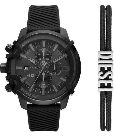 Diesel Men's Griffed Quartz Watch. The case is built with high-quality Stainless Steel and can withstand up to 50 m (165 feet) of water resistance. The dial is Black and protected by a Mineral Crystal. The Strap is Black Silicone with a Pin Buckle. The movement is Quartz. (DZ4650SET)
