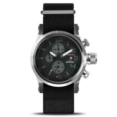 MTMs Hypertec Chrono 3 watch is intricately designed and features strong, durable components, such as a stainless steel case, locking, double O-ring sealed crown, and scratch-resistant glass. These materials allow the watch to work up to 660 feet/200 meters under water without missing a beat. At night, the watchs super luminous hands glow for easy readability. Featuring a 12Hr Stop watch.