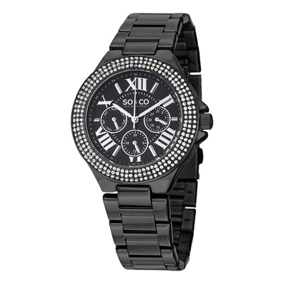 Black PVD Case on Stainless Steel Polished Bracelet, Black PVD Bezel filled with Crystals, Black Brushed Dial with Silver Tone Accents