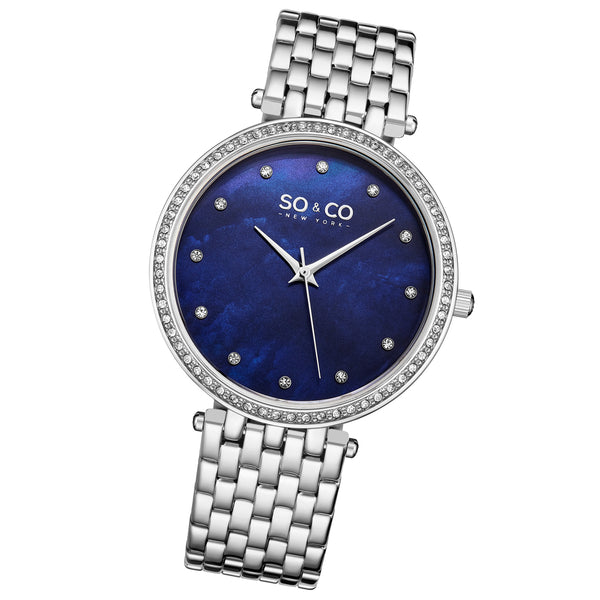Women’s Quartz Silver Case, Silver Crystal Studded Bezel, Blue MOP Dial, Silver Hands, Crystal Markers, Silver Bracelet Watch