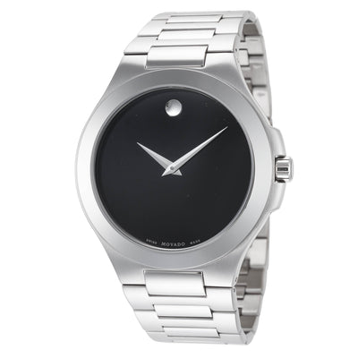 Movado Men's Movado Collection Quartz Watch. The case is built with high-quality Stainless Steel and can withstand up to 30 m (100 feet) of water resistance. The dial is Black and protected by a Sapphire Crystal Scratch Resistant. The Bracelet is Silver Stainless Steel with a Double Folding Clasp. The movement is Swiss-Made Quartz. (0606163)