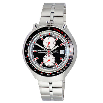 MEN'S WATCH CHRONOGRAPH WITH 24-HOUR DISPLAY, TACHYMETER, AND CALENDAR-DATE WINOW, BLACK DIAL, SILVERTONE