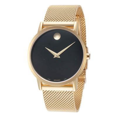 Movado Women's Museum Quartz Watch. The case is built with high-quality Stainless Steel and can withstand up to 30 m (100 feet) of water resistance. The dial is Black and protected by a Sapphire Crystal Scratch Resistant. The Bracelet is Gold Stainless Steel with a Deployment Clasp. The movement is Swiss-Made Quartz. (0607647)