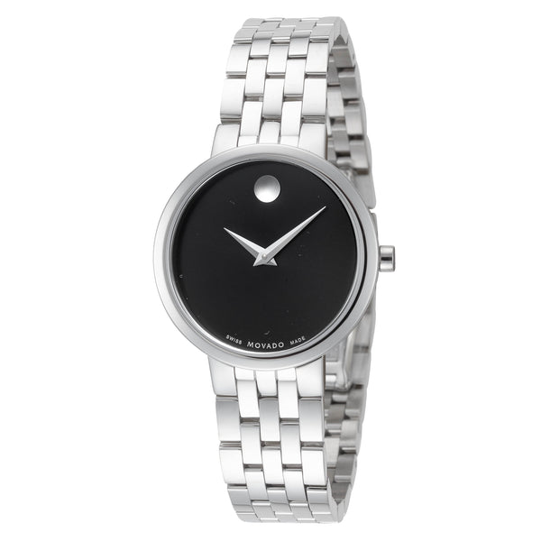 Movado Women's Museum Quartz Watch. The case is built with high-quality Stainless Steel and can withstand up to 30 m (100 feet) of water resistance. The dial is Black and protected by a Sapphire Crystal Scratch Resistant. The Bracelet is Silver Stainless Steel with a Deployment Clasp. The movement is Swiss-Made Quartz. (0607813)