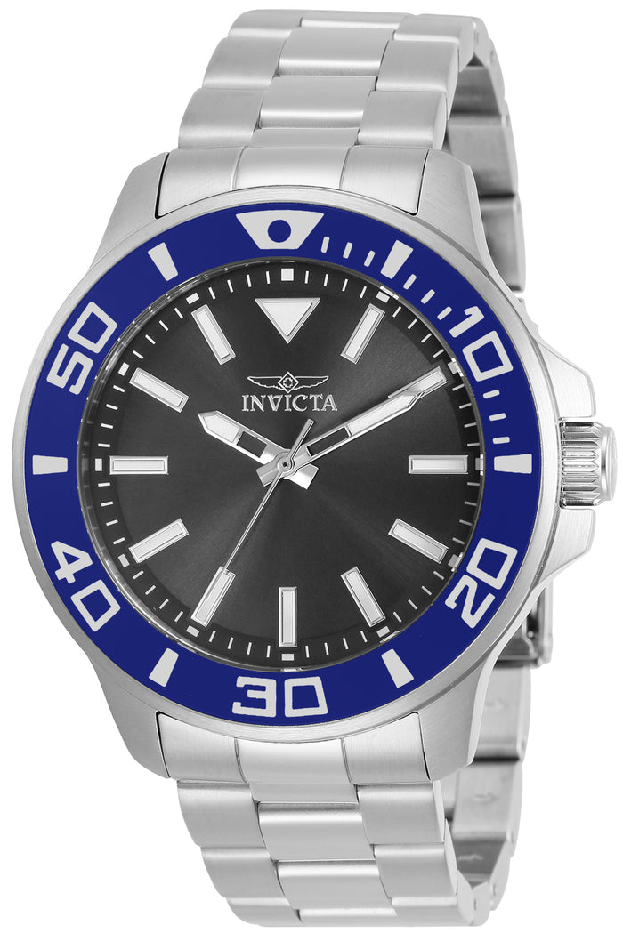Invicta Men's Pro Diver Quartz Watch. The case is built with high-quality Stainless Steel and can withstand up to 100 m (330 feet) of water resistance. The dial is Charcoal and protected by a Flame-Fusion Crystal. The Bracelet is Silver Stainless Steel with a Pin Buckle. The movement is Made in Japan Quartz. (IN-30745)