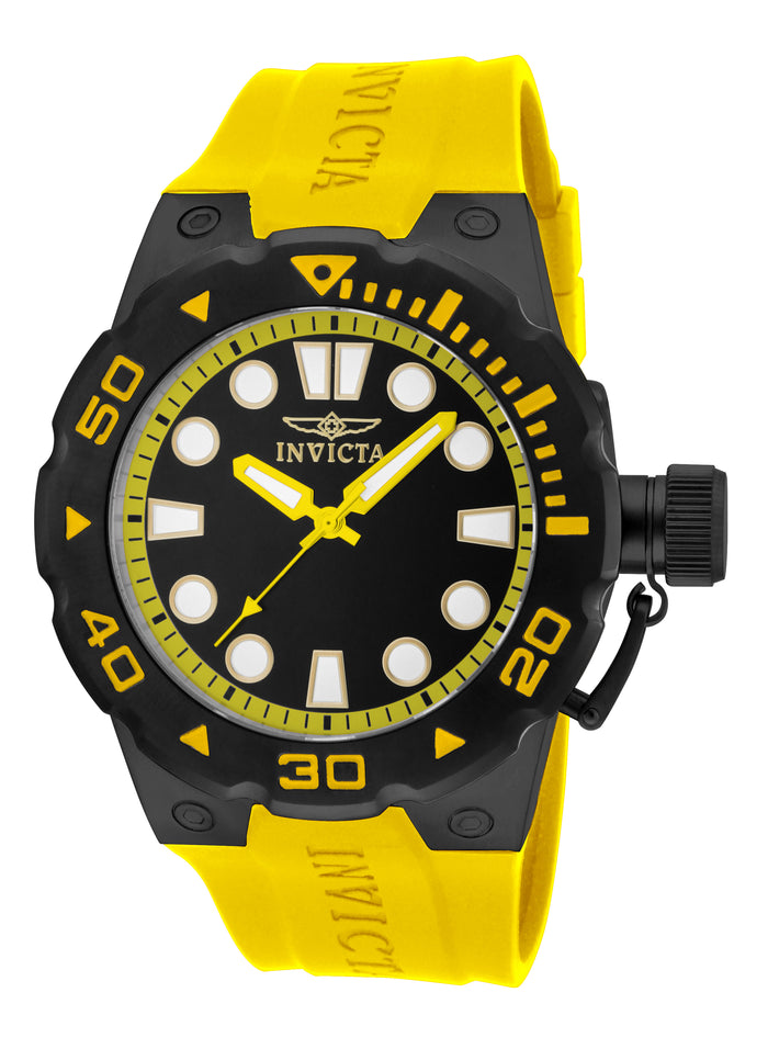 Invicta Men's Pro Diver Quartz Watch. The case is built with high-quality Stainless Steel and can withstand up to 200 m (660 feet) of water resistance. The dial is Black and protected by a Flame-Fusion Crystal. The Strap is Yellow Silicone with a Pin Buckle. The movement is Made in Japan Quartz. (IN-16138)