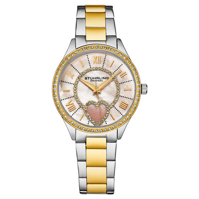 Womens Quartz crystal bezel and markers, heart theme, White Mother of pearl Dial Two tone gold plated stainless steel 3 link band Silver alloy case