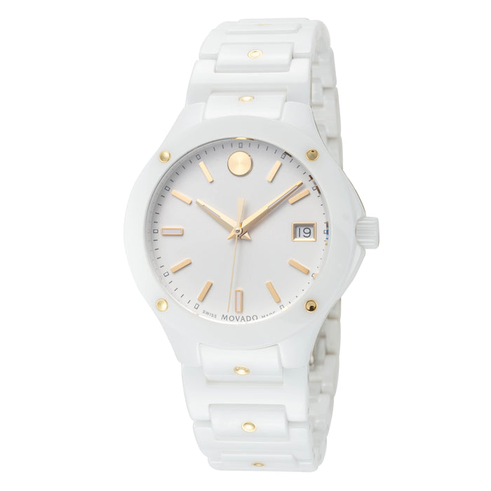 Movado Women's SE Quartz Watch. The case is built with high-quality Ceramic and can withstand up to 30 m (100 feet) of water resistance. The dial is White and protected by a Sapphire Crystal Scratch Resistant. The Bracelet is Black and Yellow Ceramic with a Deployment Clasp. The movement is Swiss-Made Quartz. (0607740)