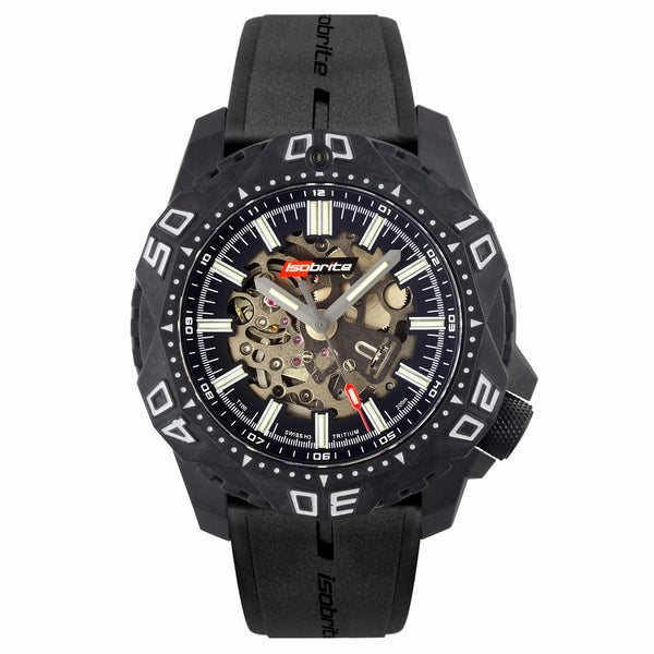 Introducing the ultimate timepiece for the modern adventurer - the watch with unparalleled precision and durability. Illuminated by 17 Swiss Made T100 tritium markers by Trigalight, this watch ensures visibility in any lighting condition. This watch features a transparent dial allowing you to witness the intricate inner workings of the mechanical movement in all its glory. The skeletonized design showcases the delicate balance wheel, gears, and springs as they come to life with each tick of the watch. Crafted with precision and attention to detail, this watch is a testament to the craftsmanship and expertise of watchmaking. Powered by a Japanese NH72 mechanical movement with 24 jewels, a self-winding bidirectional rotor, and a Diashock shock absorber, this watch combines reliability with exceptional performance. With features like manual and automatic winding, hacking, and a power reserve of approximately 41 hours, you can trust this watch to keep ticking no matter where your journey takes you. The scratch-resistant sapphire crystal with an anti-reflective coating protects the dial, while the carbon fiber reinforced polycarbonate case and stainless steel caseback ensure durability. The unidirectional ratcheting diver bezel with a tritium elapsed minute marker adds functionality and style to this timepiece. Designed for the depths, this watch boasts a water resistance of 200m (660ft / 20atm), making it suitable for any aquatic adventure. The double-gasket push-in crown with side shields further enhances the watch's robust construction. Backed by a 2-year warranty, this watch is not just a timekeeping device but a companion for all your expeditions. Elevate your wrist game with this exceptional timepiece that blends style, functionality, and reliability seamlessly.