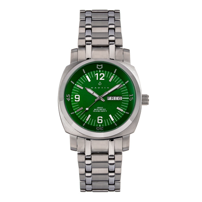 316L Surgical-Quality Stainless Steel Case Accurate Swiss Quartz Movement Non-Glare Scratch-Resistant Mineral Crystal Logo-Engraved Stainless Steel Caseback 316L Surgical-Quality Stainless Steel Bracelet Logo-Engraved Stainless Steel Fold-Over Push-Button Deployment Clasp Luminous Hands Day Indicator Date Indicator 45mm Case Diameter 20 ATM Water Resistance (Professional Deep Diving Approved)