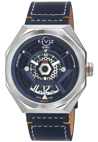 GV2 Stella Solare – Swiss Solar Precision. Elevated. Boldly contemporary yet driven by the eternal power of light, the GV2 Stella Solare is a commanding timepiece designed for the modern man who expects performance without compromise—and distinction in every detail. Design That Commands Attention Crafted from 44mm of finely polished 316L stainless steel, the round case makes a powerful statement—substantial on the wrist, yet refined in silhouette. Its dial, reminiscent of the night sky just before dawn, is framed by an anti-reflective sapphire crystal, offering both clarity and quiet strength. A rubber strap with a seamless deployment buckle adds a subtle yet unmistakable contrast—athletic in spirit, luxurious in execution. Water resistance to 50 meters (5 ATM) ensures durability in everyday settings—whether navigating the city or escaping it. Engineered by Light: Swiss Ronda 212 Solar Movement At its core is the Swiss-made Ronda Solartech 212—a solar-powered quartz movement that exemplifies precision engineering and technical sophistication. Solar-powered accumulator stores energy from any light source—sunlight or artificial. Delivers up to eight months of power reserve on a full charge, with no need for battery changes. Quick-start functionality gets the watch ticking in under a minute of bright exposure. A power-saving crown function reduces consumption by 70%, ideal for those who alternate timepieces. This is not just smart—it’s sustainably Swiss, with the sharp accuracy and reliability expected of a GV2. Stella Solare: Where Light Meets Legacy Meaning “Solar Star” in Italian, Stella Solare is a tribute to brilliance—the natural brilliance of light, and the brilliance of a man who leads with clarity, conviction, and quiet confidence.