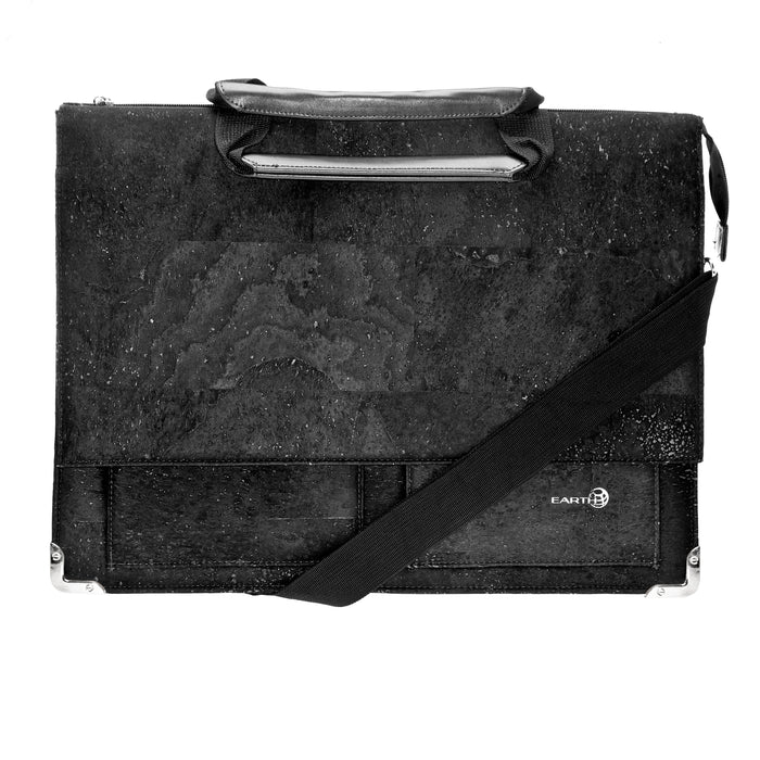 Material outer cover 100% natural cork. It is hypoallergenic and easy to maintain. It is soft to the touch yet withstands rugged use. Size: 16.25 Inches in width 12 inches in height Front outside 2 pockets each pocket is 6.5 inches width 7 inches in depth Closure push button metal clasp Backside: one 12 inch zipper sleeve 6 inch handle on top securely stud bolted to case and machine stitched with one metal ring to hold multi weaved nylon strap for shoulder carrying use. Metal lobster clasp to adhere to briefcase. Interior hidden structured Nylon for strength Interior 2 large open pockets for laptop computer or file paperwork each pocket has a 12 inch zipper closure One open pocket has a 10 inches interior zipper pocket. Second open pocket has a holder mobile phone and a holder for pens Machined stitched. NO Glue