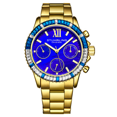 Ladies Chrono Gold Toned Case, Silver and Dark Blue Bezel, Dark Blue MOP Dial, Gold Toned Hands and Markers, Gold Toned Bracelet Watch
