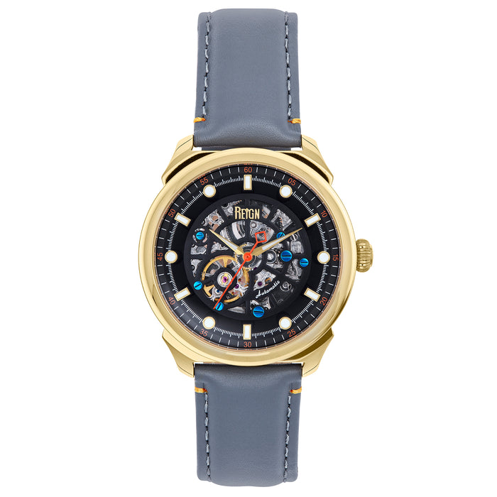 Band Color: Grey Genuine Leather Band Width: 22mm near case; 20mm near clasp/buckle Bezel Color: Gold Case: Gold + Circle-Shaped Case Finish: Polished + Stainless Steel Case Thickness: 13mm Case Width: 44mm; 47mm with Crown Clasp / Buckle: Strap Buckle Dial: Black + Analog Hand Color: Gold Movement: Chinese + Automatic Time Zones: Single Water Resistance: 5 ATM