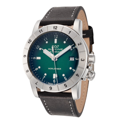 Glycine Men's Airman Worldtimer 42mm Watch GL1021. The case is built with high-quality Stainless Steel and can with stand up to 100 m (330 feet) of water resistance. The dial is Green and protected by a Sapphire Crystal Scratch Resistant. The Strap is Black Leather and the movement is Quartz. (GL1021)