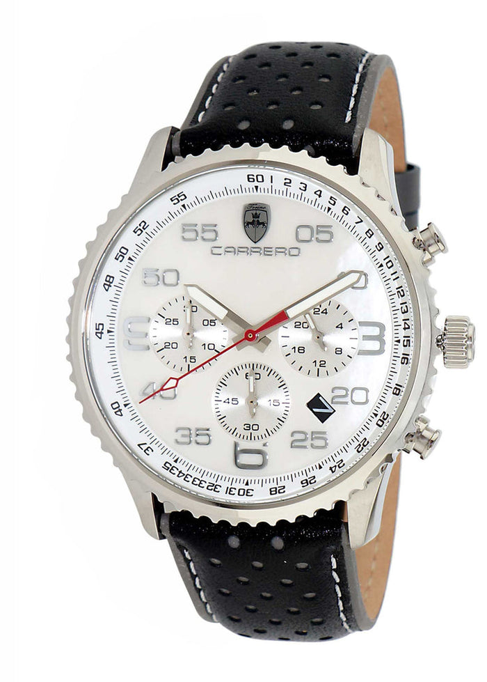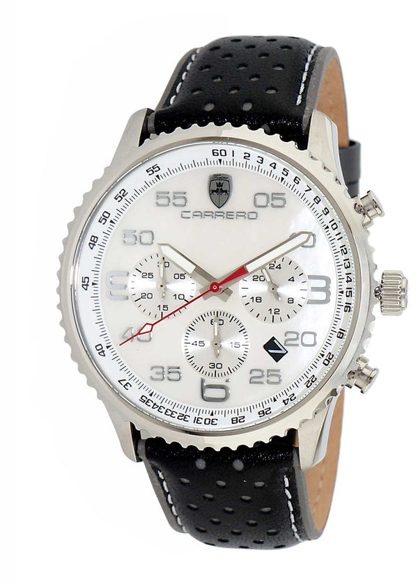 Aureum Men's Chronograph Movement- Epson VR32, White Mother of Pearl Date Dial, Silver tone Stainless Steel Case and Black Genuine Leather band.