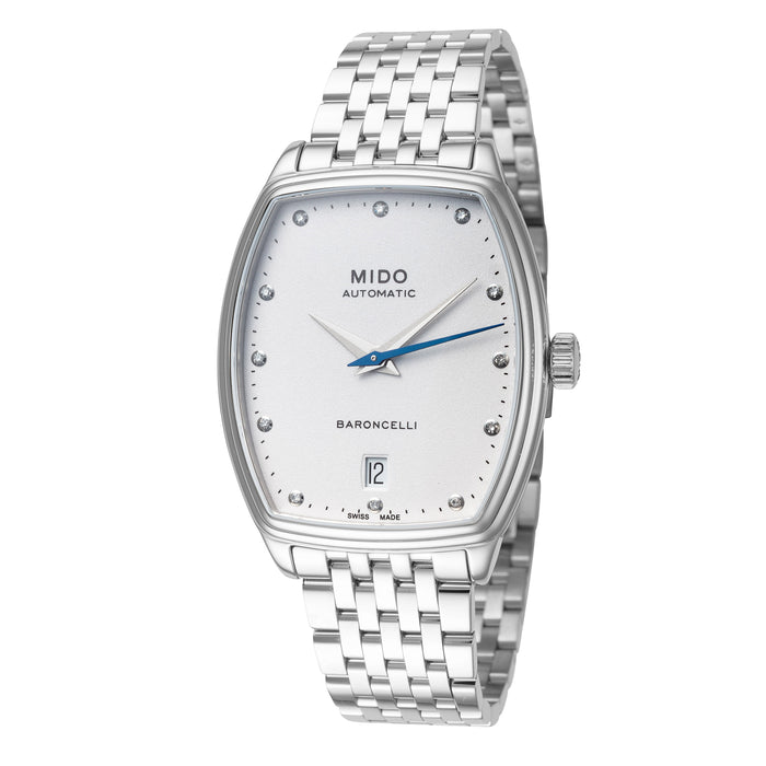 Mido Women's Baroncelli 31mm Watch M0413071101600. The case is built with high-quality Stainless Steel and can with stand up to 30 m (100 feet) of water resistance. The dial is White and protected by a Sapphire Crystal Scratch Resistant. The Bracelet is Silver Stainless Steel and the movement is Automatic. (M0413071101600)