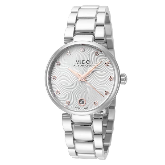 Mido Women's Baroncelli 33mm Watch M0222071103610. The case is built with high-quality Stainless Steel and can with stand up to 50 m (165 feet) of water resistance. The dial is Silver and protected by a Sapphire Crystal Scratch Resistant. The Bracelet is Silver Stainless Steel and the movement is Automatic. (M0222071103610)