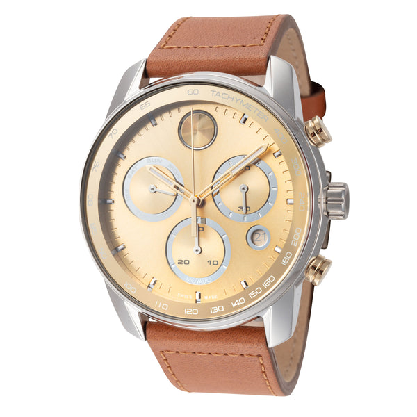 Movado Men's Bold Quartz Watch. The case is built with high-quality Stainless Steel and can withstand up to 50 m (165 feet) of water resistance. The dial is Gold and protected by a K1 Mineral Crystal (Scratch Resistant). The Strap is Camel Leather with a Pin Buckle. The movement is Swiss-Made Quartz. (3600908)