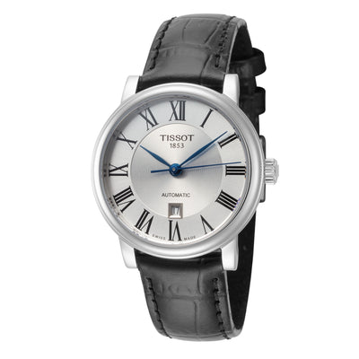 Tissot Women's Carson Automatic Watch. The case is built with high-quality Stainless Steel and can withstand up to 50 m (165 feet) of water resistance. The dial is Silver and protected by a Sapphire Crystal Scratch Resistant. The Strap is Black Leather with a Pin Buckle. The movement is Swiss-Made Automatic. (T1222071603300)