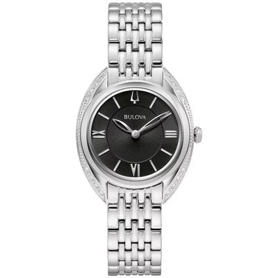 Bulova Women's Classic 30mm Quartz Watch 96R252. The case is built with high-quality Stainless Steel and can withsand up to 30 m (100 feet) of water resistance. The dial is Black and protected by a Mineral Crystal. The Bracelet is Silver Stainless Steel. The movement is Quartz. (96R252)