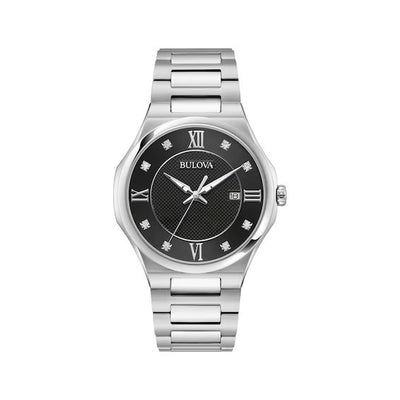 Bulova Men's Classic 41mm Quartz Watch 96D156. The case is built with high-quality Stainless Steel and can withsand up to 30 m (100 feet) of water resistance. The dial is Black and protected by a Mineral Crystal. The Bracelet is Silver Stainless Steel. The movement is Quartz. (96D156)