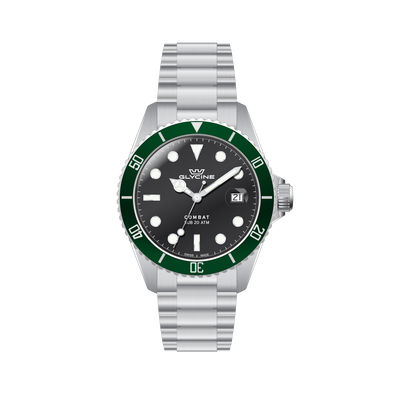Glycine Men's Combat 40mm Watch GL1061. The case is built with high-quality Stainless Steel and can with stand up to 200 m (660 feet) of water resistance. The dial is Black and protected by a Sapphire Crystal Scratch Resistant. The Bracelet is Silver Stainless Steel and the movement is Quartz. (GL1061)