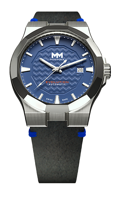 Minimax Evolution stainless steel watch with blue dial, black leather band with blue stitching. Includes 3-in-1 Minimax tool.