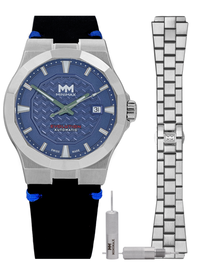 Minimax Evolution stainless steel watch with blue dial, black leather band with blue stitching and spare stainless steel link bracelet.