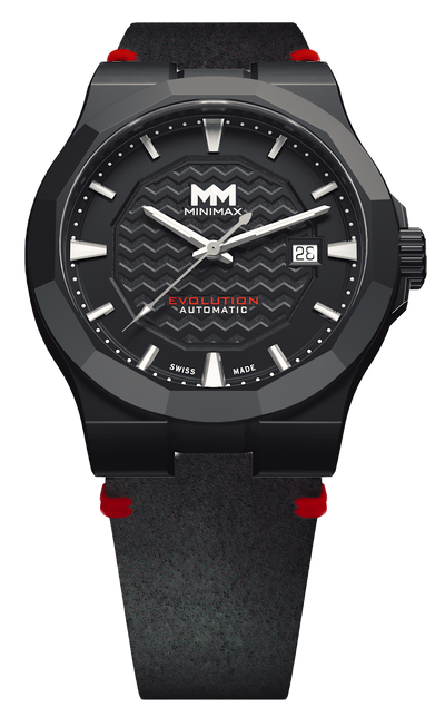 The Swiss made Minimax Evolution features a handcrafted Italian calf leather band. The watch has an exhibition case-back powered by an ETA-2824-2 automatic movement and is water resistant up to 10 ATM. Movement Manufacturer: ETA SA Manufacture Horlogère Suisse Model: 2824-2 Jewels: 25 Features: Hours, minutes, sweep seconds and date with quick setting. Frequency: 28'800 vibrations per hour (4 Hz). Running Time: 42 Hours. Case Material: DLC Coated Stainless Steel 316L. Water Resistance: 100 M / 10 ATM / 300Ft. Caseback: Exhibition Screw-down. Crystals: Sapphire w/ Interior Anti-reflective coat. Dial: Milled Indexes. Crown: S/S 316L Double OR Joint. Diameter: 42.0 mm Lug Width: 22.0 mm Lug to Lug: 49.50 mm Case Thickness: 11.85 mm Leather Band Tang Buckle Material: DLC Coated Stainless Steel 316L. Band: Italian Made Crazy Horse Calf Leather Band size: 21 cm.