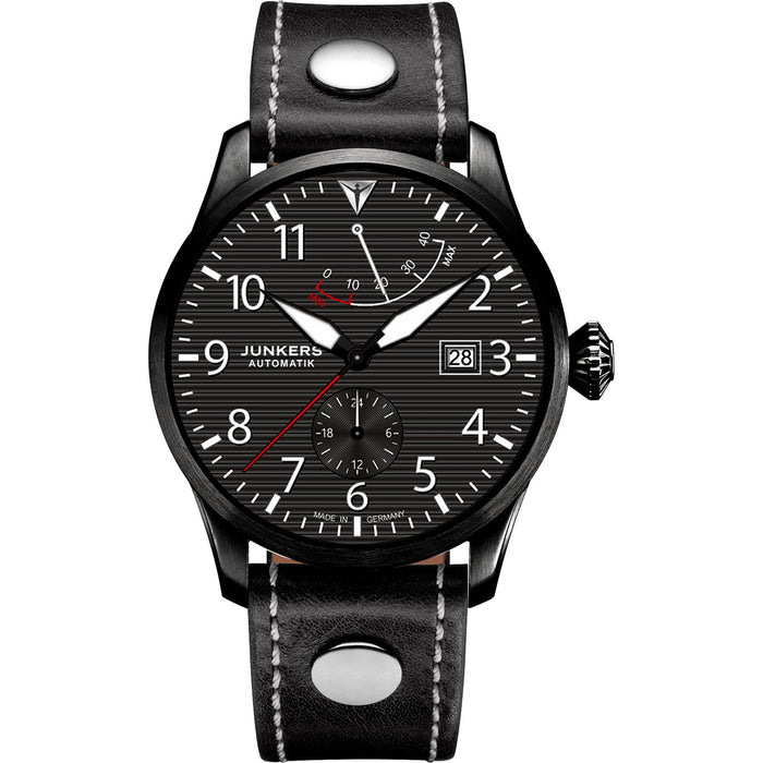 Extended Ship Time From Germany. Pilot's watch automatic with power reserve and 24-hour display Color black 42 mm leather strap Sapphire crystal No. 965.01.02 - Junkers watches from the Flieger series are modelled on the on-board instruments of aircraft of a time when people still flew with the help of analogue displays and a view to the outside. They reduce a watch to its true function: clear display of the time, analogue and clearly recognisable at a glance. All watches in the Junkers Flieger series are equipped with fluorescent hands. The models with a dark dial naturally also come with luminous material on the numerals and indices. In1919, when there were still more horse-drawn carriages on the roads than automobiles, the Junkers F13 took off on its maiden flight in Dessau, Saxony-Anhalt. It was the first all-metal commercial aeroplane in the world capable of carrying passengers, mail and freight. And the fact that its outer shell was made of durable corrugated duraluminium sheet was a revolutionary idea of its designer, the aircraft manufacturer Hugo Junkers.Today, the Junkers F13 is taking off again, offering its pilots and passengers the unique experience of travelling through the air as it did 100 years ago. The visionary idea came from the passionate pilot Dieter Morszeck, who has had the new Junkers F13 faithfully reproduced by his design team - whereby all materials and workmanship have of course been further developed to make the new Junkers F13 even safer and more stable in value.