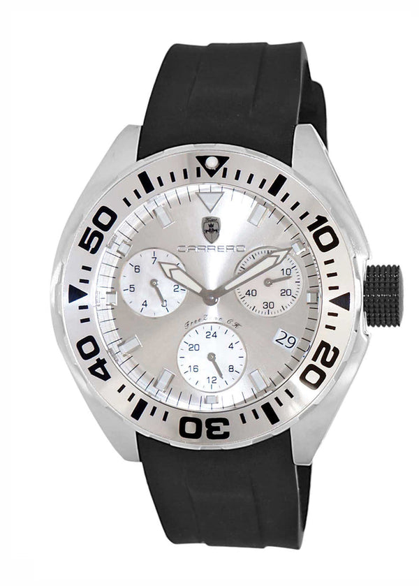 TORINO CARRERO FreeZone-CH, Men's Swiss Multi-Functiom Ronda X30 Movement, White Dial with White MOP Sub-dial - Silver Bezel - IP Black Crown, Silicon Band