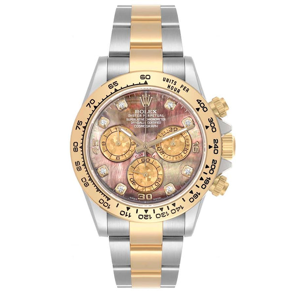 PRE-OWNED The Rolex Cosmograph Daytona Ref. 116503 is a luxury chronograph that combines Rolex’s racing heritage with refined elegance, featuring a 40 mm Oyster case crafted in stainless steel and 18k yellow gold. It showcases a rare Tahitian mother-of-pearl dial accented with factory diamond hour markers, giving each watch a unique, iridescent appearance. Powered by Rolex’s in-house Caliber 4130 automatic chronograph movement, it offers exceptional precision and a 72-hour power reserve. The yellow gold tachymeter bezel, two-tone Oyster bracelet, and 100 m water resistance complete the design, making this Daytona a striking blend of sport performance and high-end luxury suitable for both collectors and everyday wear.