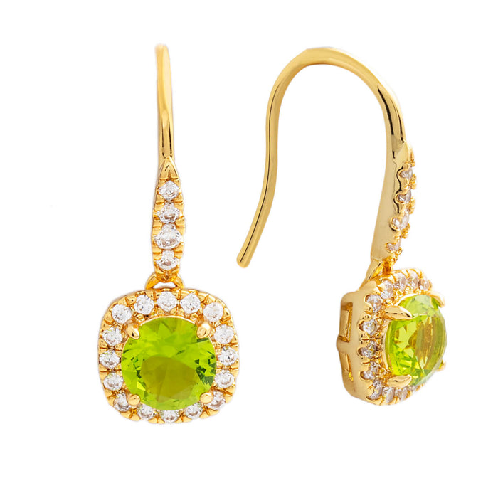 A gorgeous cushion cut stone, surrounded by a clear halo, drops dramatically from an 18 karat gold plated curved bar. This pair is bold, yet elegant.