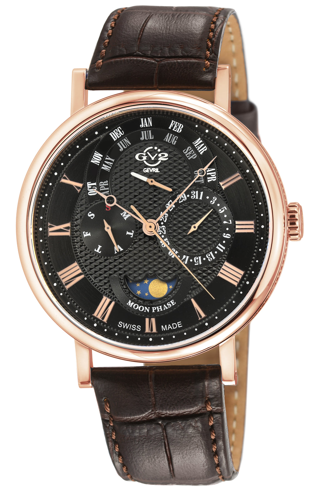Introducing the GV2 Men's Maestro Watch—a refined timepiece that orchestrates elegance with precision. Crafted for the modern man who commands with sophistication, this Swiss Quartz watch from the Maestro Collection combines intricate details with a robust design. The 48mm 316L stainless steel case is both imposing and graceful, enhanced by a distinctive bezel ring. Its textured dial features three functional sub-dials and a moon phase indicator, showcasing meticulous artistry and practical utility. Inspired by the Italian term Maestro, this watch is a tribute to leadership and mastery, combining style and substance in equal measure.