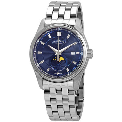 Swiss elegance meets celestial detail. The Armand Nicolet MH2 features a deep blue dial with moonphase display, powered by a Sellita SW280 automatic movement inside a 42mm stainless steel case with sapphire crystal and exhibition caseback.