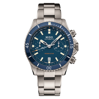 Mido Men's Ocean Star 44mm Watch M0266274404100. The case is built with high-quality Stainless Steel and can with stand up to 200 m (660 feet) of water resistance. The dial is Blue and protected by a Sapphire Crystal Scratch Resistant. The Bracelet is Silver Titanium and the movement is Automatic with Chronograph functions. (M0266274404100)