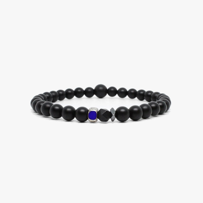 Blue and silver Czech glass, faceted onyx, gunmetal details on a black onyx beaded bracelet. Bead Size: 6mm