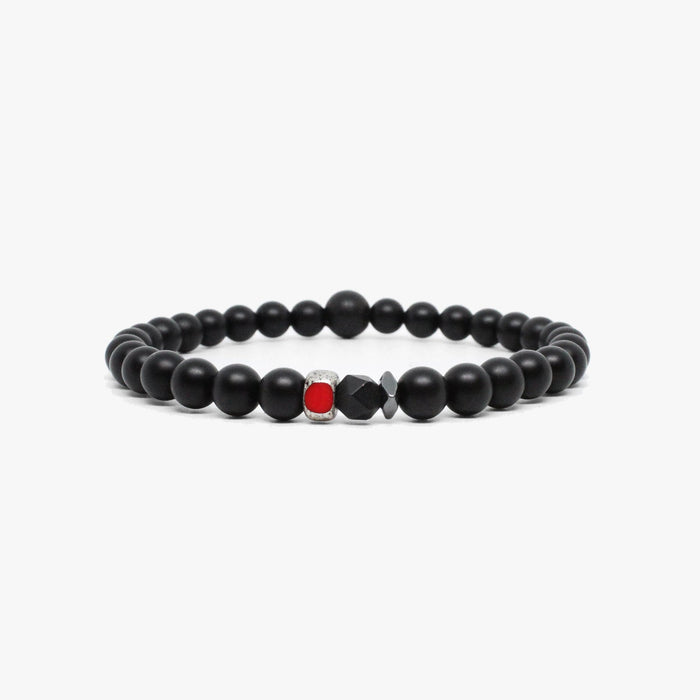 Red and silver Czech glass, faceted onyx, gunmetal details on a black onyx beaded bracelet. Bead Size: 6mm
